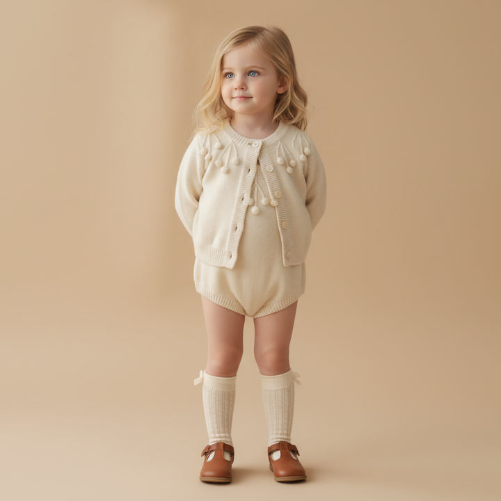 A little gem of softness and originality for baby's first summers. This ecru knit romper seduces with its pretty hanging pompoms and buttoned straps which give it a deliciously retro charm.