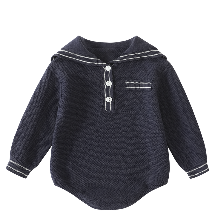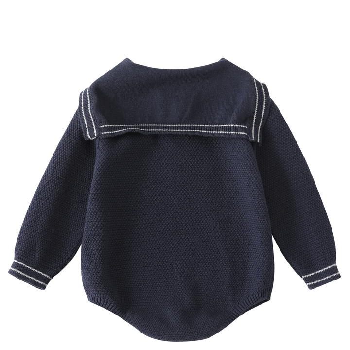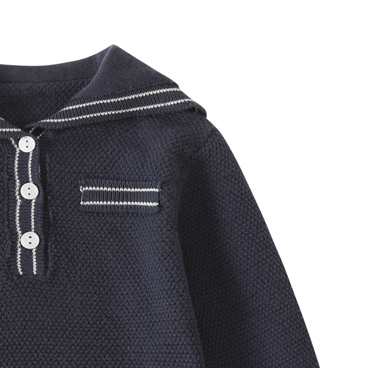 A classic reinvented for little explorers. Its textured knit and sailor collar with contrasting topstitching are reminiscent of outfits from yesteryear, full of adventure and tenderness.