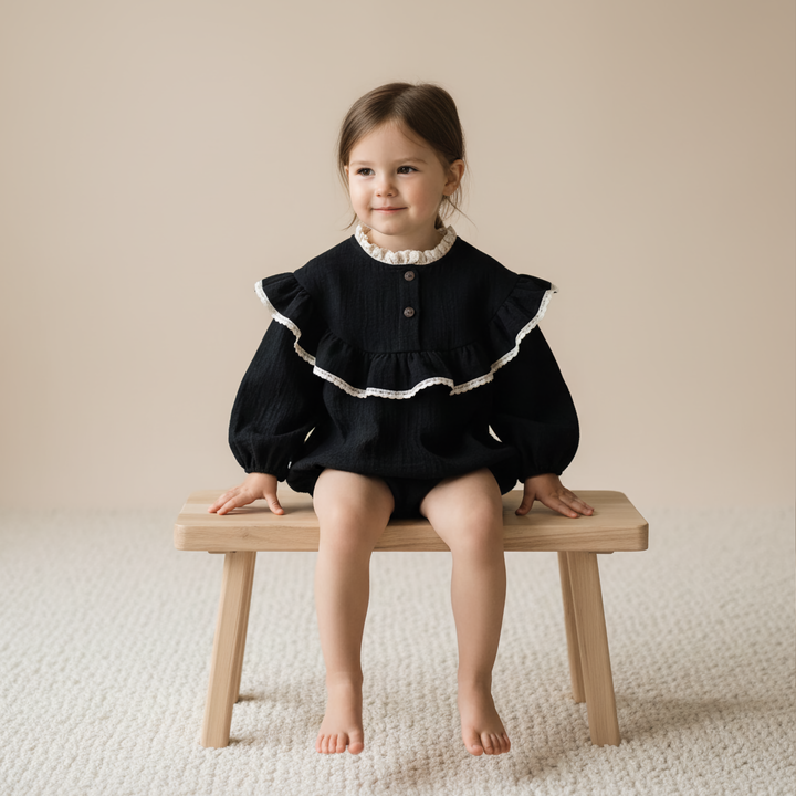 Élégante et confortable, cette barboteuse noire en double gaze de coton est un véritable coup de cœur. Son grand volant souligné d'une fine dentelle blanche apporte une touche chic et intemporelle. Un essentiel du vestiaire raffiné à porter aussi bien au quotidien que pour les moments plus habillés.