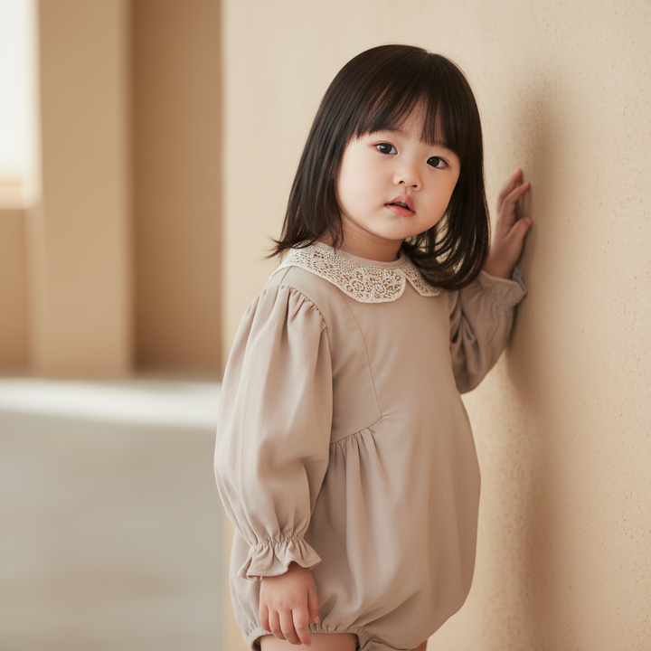 Une barboteuse délicate et intemporelle : son col Claudine orné de dentelle et ses manches bouffantes en font une pièce pleine de charme et de douceur. Confortable et élégante, elle habille bébé en toute occasion.