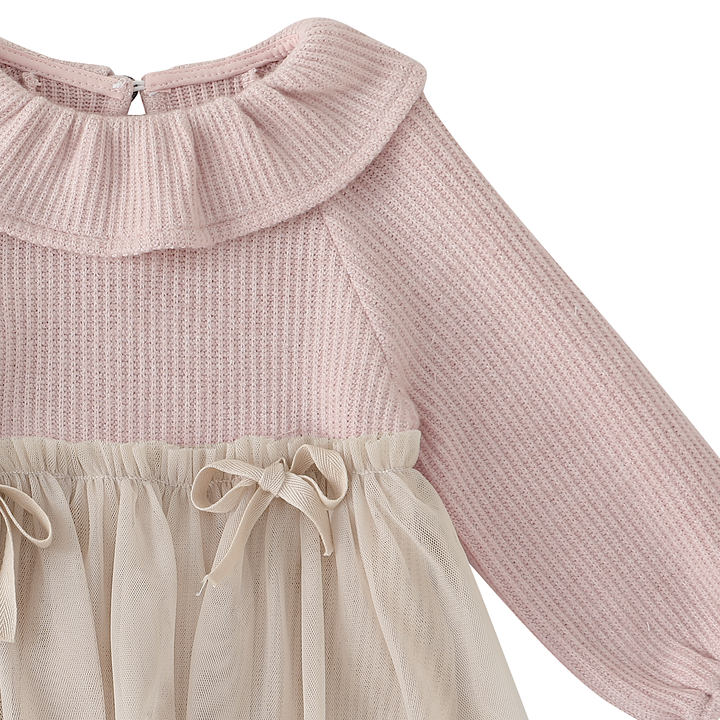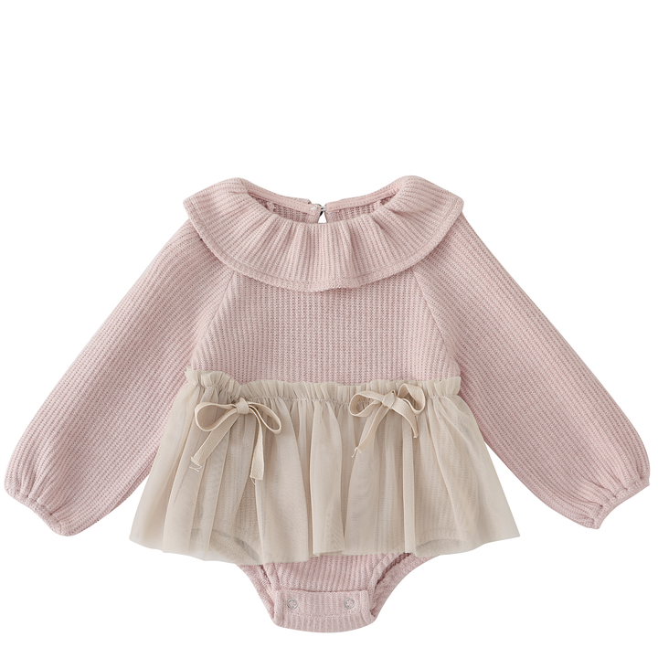Une barboteuse tendre et élégante : sa maille texturée rose poudré s’accorde à une jupe légère en tulle beige, nouée de petits rubans. Une pièce poétique et confortable à la fois.