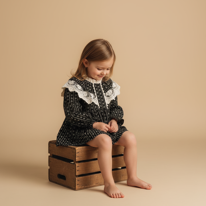 Une barboteuse élégante et rétro, avec son imprimé géométrique et son grand col orné de dentelle. Un petit bijou d’originalité pour des instants précieux.
