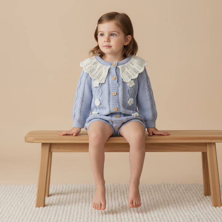 Un tricot raffiné et poétique : ce gilet bleu ciel séduit par ses détails ajourés, ses petites fleurs appliquées et son col dentelle ivoire. Une pièce au charme intemporel qui apporte chaleur et élégance au quotidien.