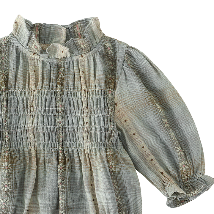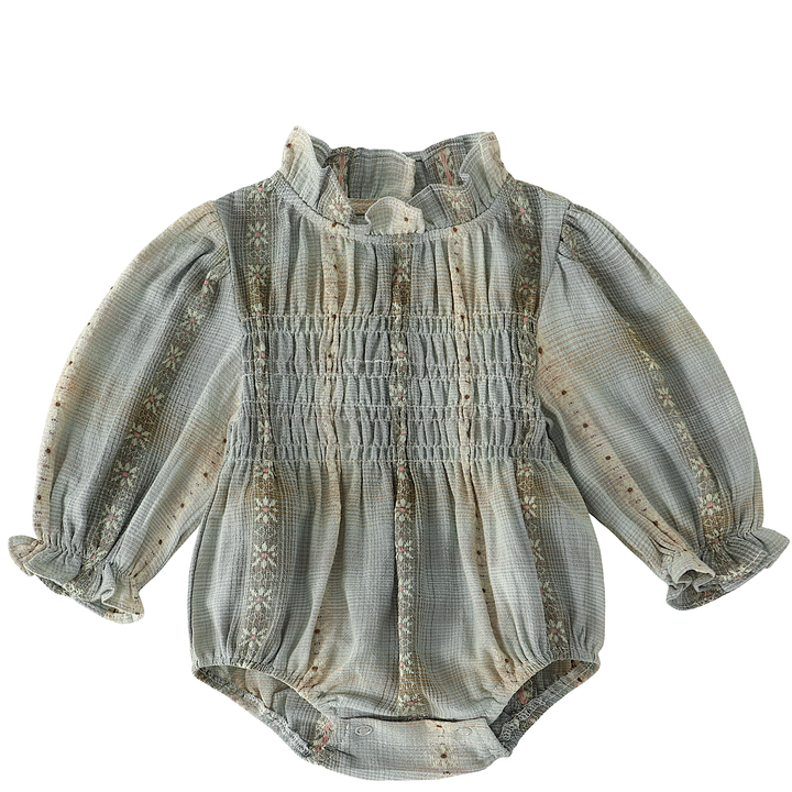 - Détails : Smocks brodés sur le buste, fronces sur les poignets, pressions à l’entrejambe.