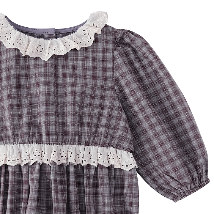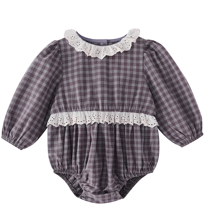Un style vintage revisité : cette barboteuse à carreaux se distingue par son col et sa taille ornés de dentelle anglaise. Son tissu doux et légèrement gaufré apporte chaleur et confort.