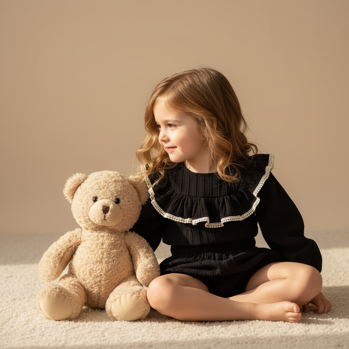 Un ensemble raffiné et moderne : le haut noir à col volanté bordé de dentelle se marie avec un bloomer assorti pour une allure élégante et intemporelle. Le contraste délicat entre la broderie blanche et la profondeur du noir crée un charme unique.