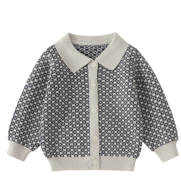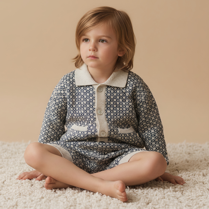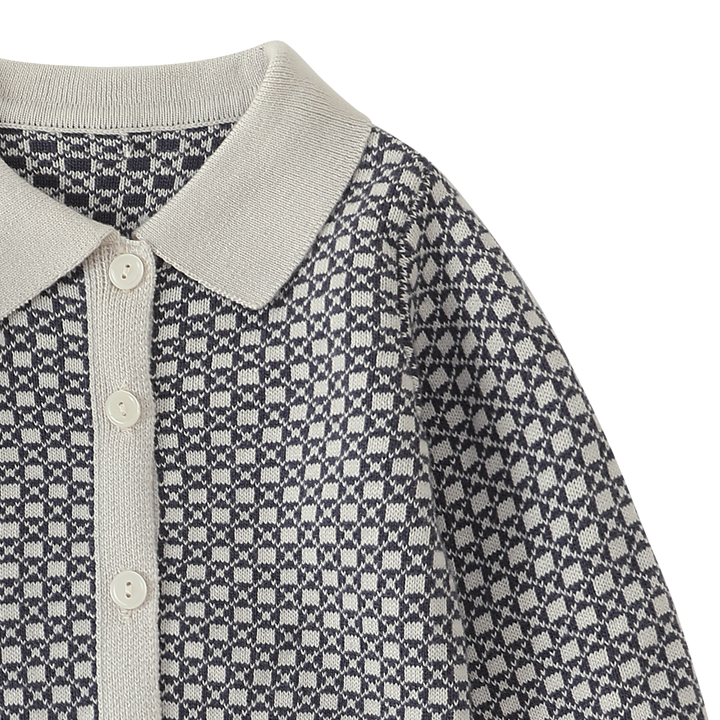 Un ensemble raffiné au motif jacquard délicat, inspiré du charme des tricots nordiques. Sa maille douce et son col polo contrasté créent une allure élégante et intemporelle.