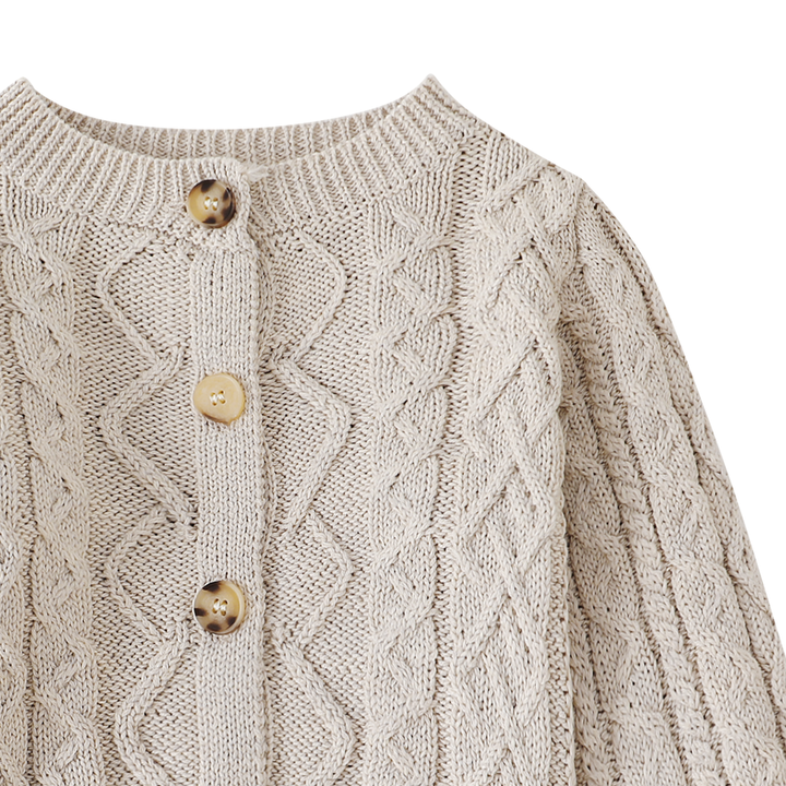 Un tricot d’exception, à la fois doux et structuré, qui enveloppe l’enfant dans un cocon de chaleur. Ses torsades délicates et ses boutons bois en font une pièce intemporelle.