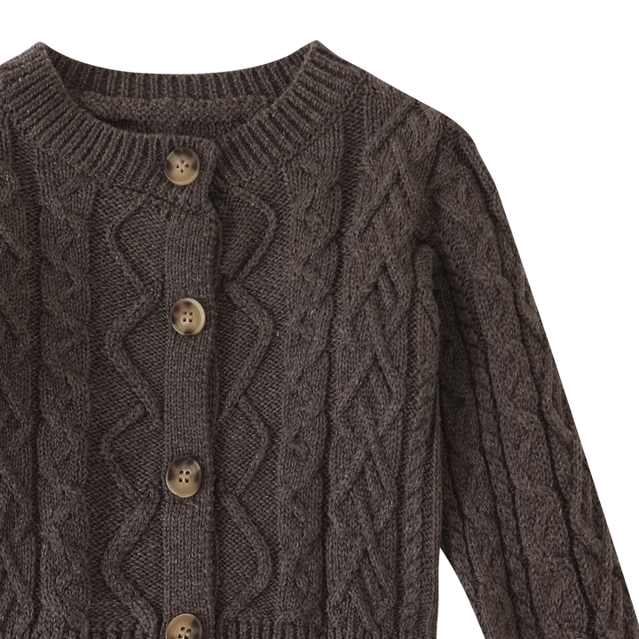 Un gilet d’automne aux reflets de chocolat chaud, tricoté dans une maille épaisse et moelleuse. Parfait pour accompagner les tenues de saison dans une palette douce et naturelle.