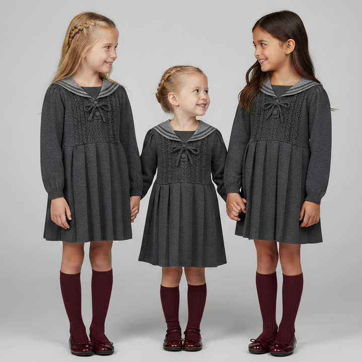 Une robe au charme rétro marin : son col inspiré des uniformes et son plastron tricoté donnent à cette pièce une allure élégante et intemporelle. Une robe pleine de caractère, parfaite pour les moments précieux.