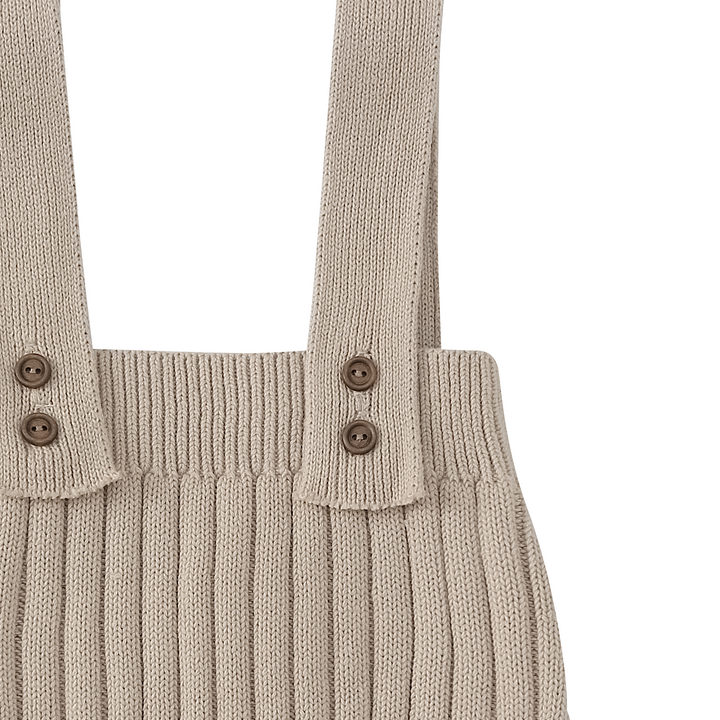 Un basique au charme rétro : ce petit bloomer à bretelles tricoté dans une teinte neutre accompagne bébé avec douceur et style. Confortable et élégant, il est parfait seul ou superposé.