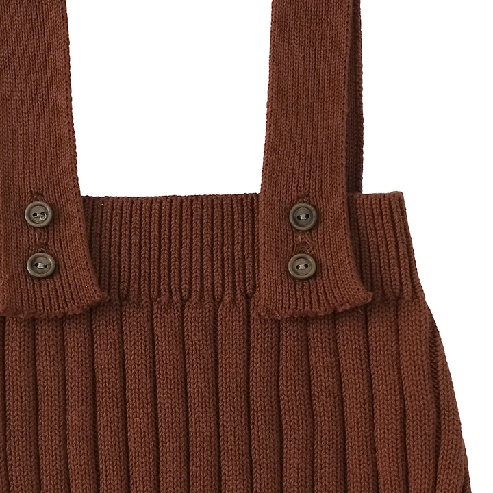 Un essentiel au charme rétro : ce bloomer à bretelles est pensé pour les premiers looks chics de bébé. Sa maille côtelée apporte confort et maintien, tandis que sa couleur chocolat lui confère un style raffiné et chaleureux.