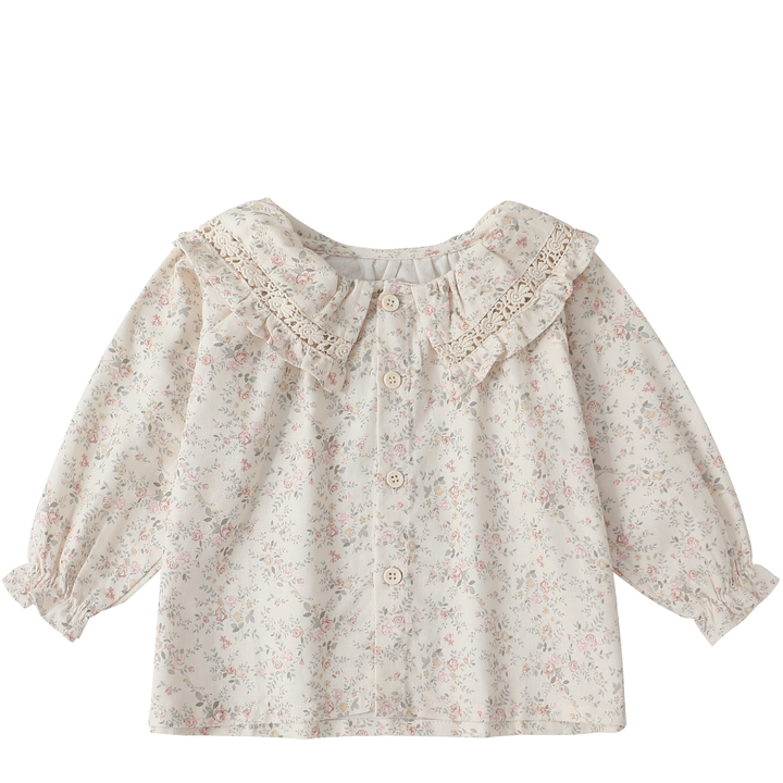 Une blouse romantique et légère : son imprimé fleuri pastel s’accompagne d’un col volanté souligné de dentelle. Un souffle rétro pour habiller les petites filles avec grâce.