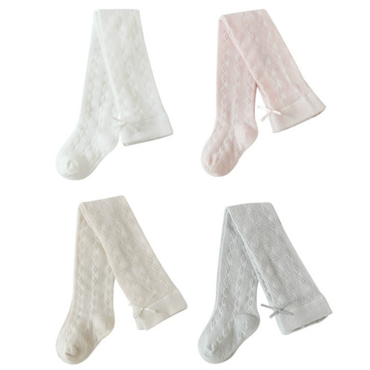 Un essentiel tendre et raffiné : ces collants crème en maille ajourée habillent les petites jambes avec douceur et élégance. Leur texture délicate et leur petit nœud à la cheville ajoutent une touche poétique aux tenues de saison.