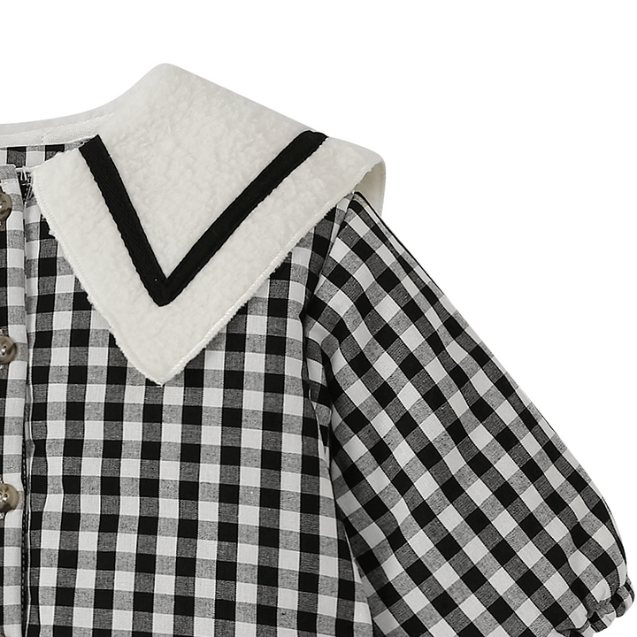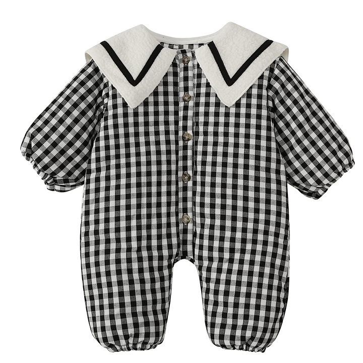 Une version élégante et graphique : combinaison vichy noir reprend l’iconique col marin contrasté pour une allure pleine de caractère. Son tissu doux et ses détails soignés en font une pièce unique.