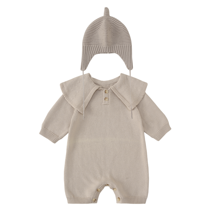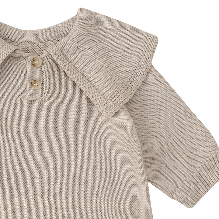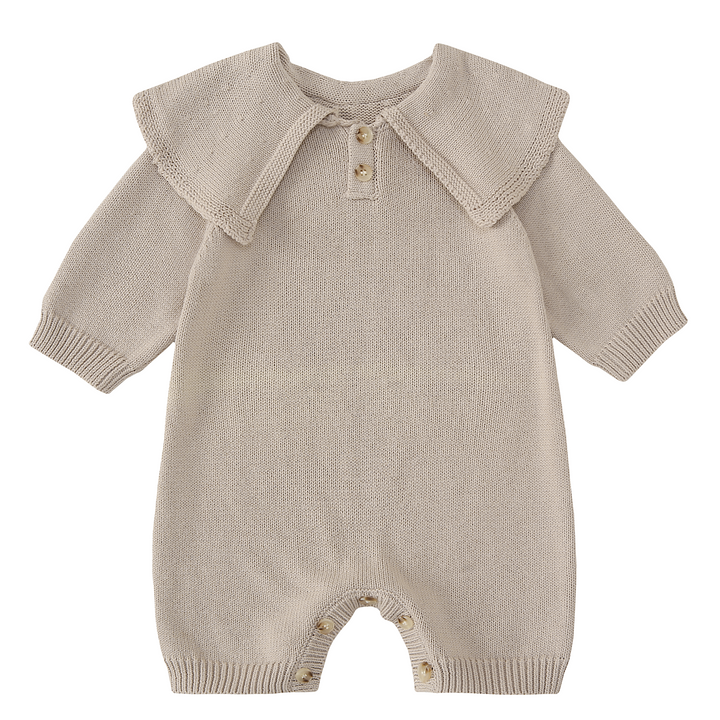 - Modèle : Barboteuse à manches longues avec col volant tricoté.