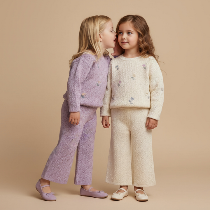Un ensemble poétique et confortable qui respire la douceur : un pull en maille ajourée orné de délicates fleurs brodées, accompagné d’un pantalon large assorti. Une tenue qui allie confort et élégance, idéale pour les journées d’automne comme pour les fêtes de famille.