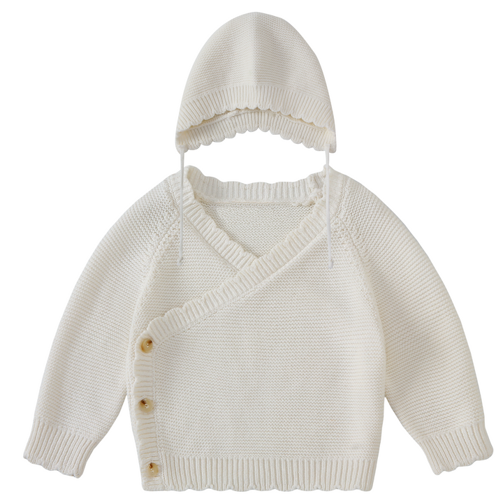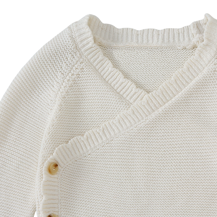 Un basique élégant et délicat : ce cache-cœur en tricot écru enveloppe bébé de douceur avec sa coupe croisée et ses boutons bois. Une pièce simple et poétique qui s’accorde avec toutes les tenues.