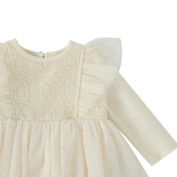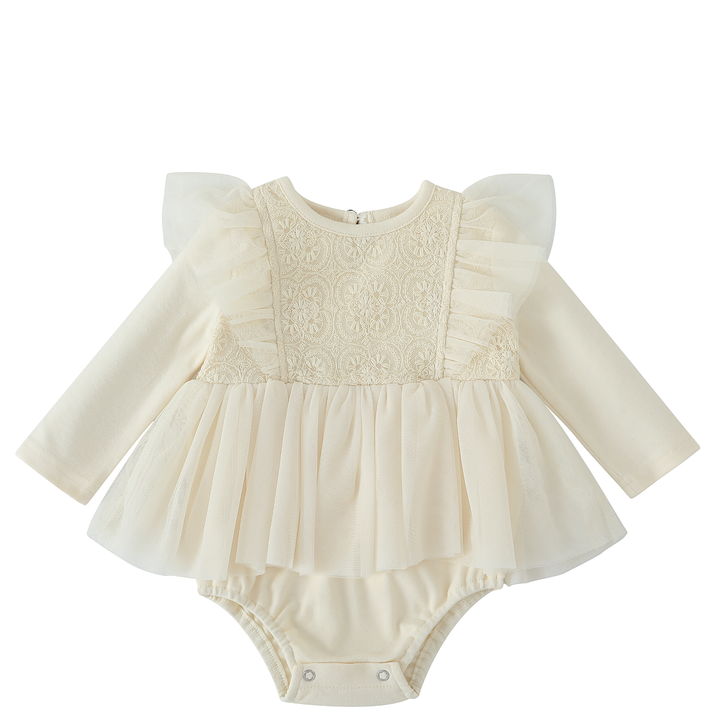 A precious and refined romper: its tulle ruffles and lace-embroidered bib make it a delicate and timeless piece. Chic and comfortable, it will enhance baby's figure on special occasions.