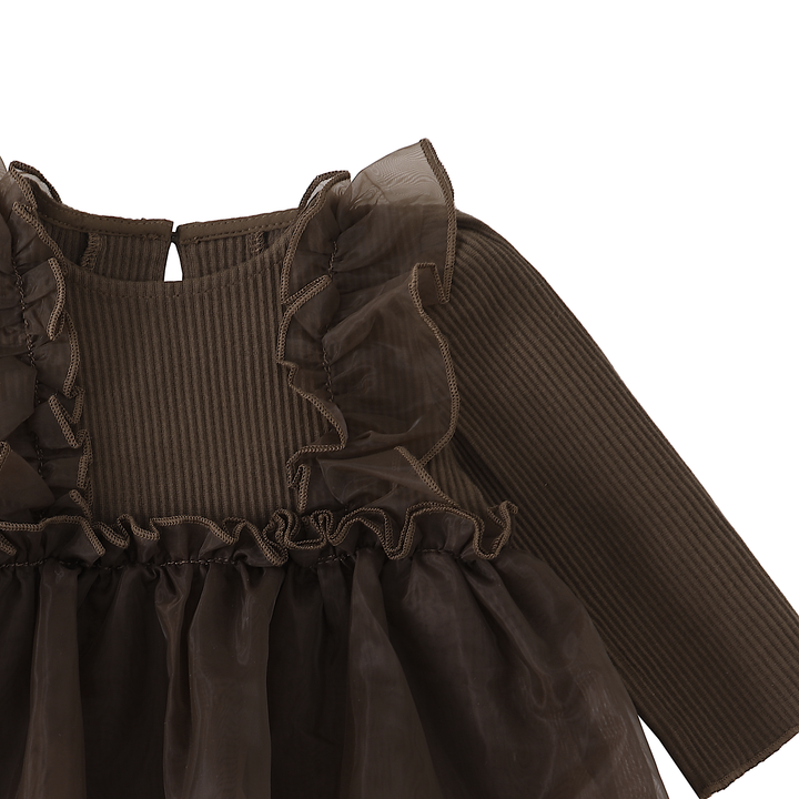 A romper with a delicate, retro charm: its airy ruffles and light voile skirt contrast beautifully with the chocolate ribbed fabric. An elegant piece to gently accompany baby.