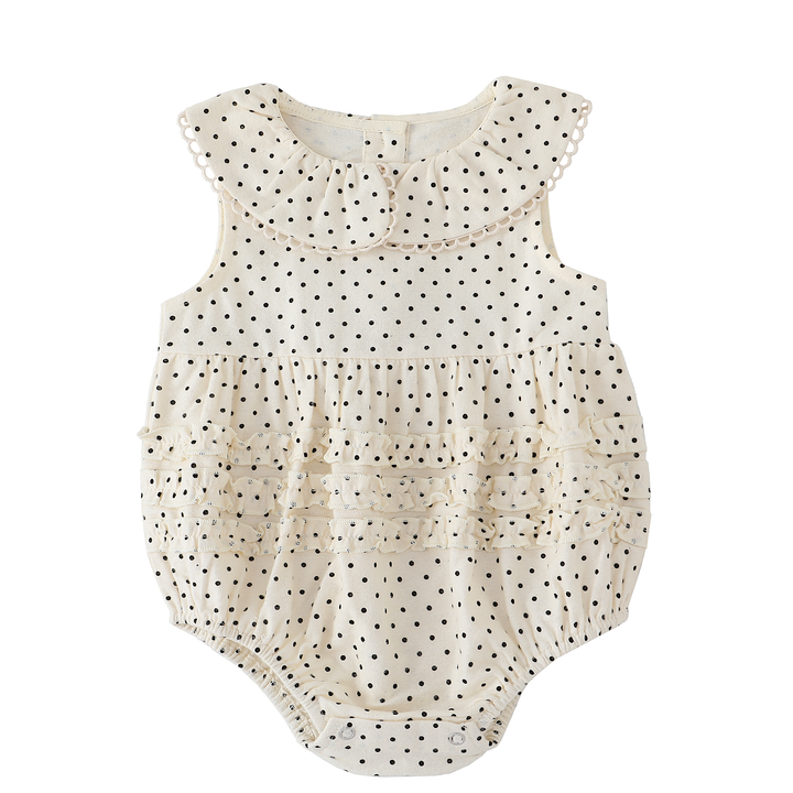 A romper full of charm: its contrasting polka dots and round ruffled collar make it a cheerful and timeless piece. Lightweight and practical, it dresses baby elegantly every day.