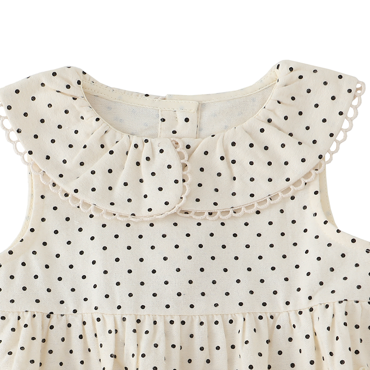 - Details: Round ruffled collar, black polka dot print, ruffles on the bust.