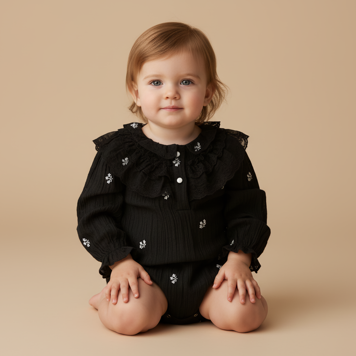 A romper full of character: its black fabric delicately embroidered with small white flowers and its romantic ruffled collar make it an original and refined piece. A chic and comfortable garment for baby.