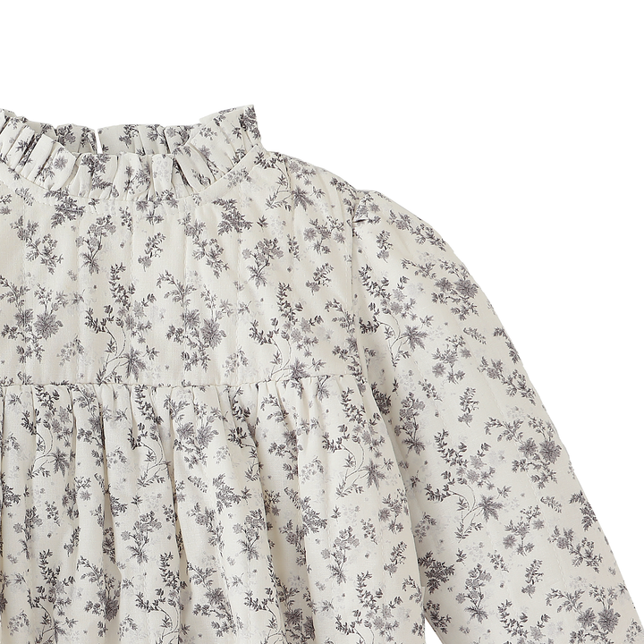 - Details: Gathered collar, soft gray floral print, loose fit.