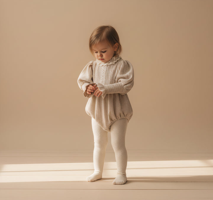 An exceptional piece for beautiful days and tender memories. This romper features puffed sleeves, a double lace collar, and delicate smocking at the cuffs. Inspired by the outfits of yesteryear, it adds a touch of grace to every baby move.