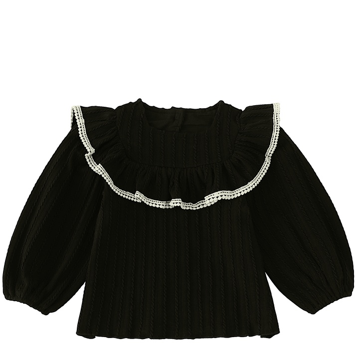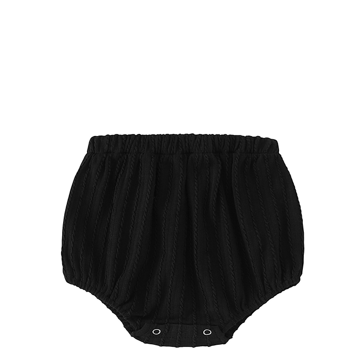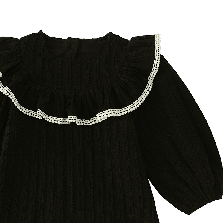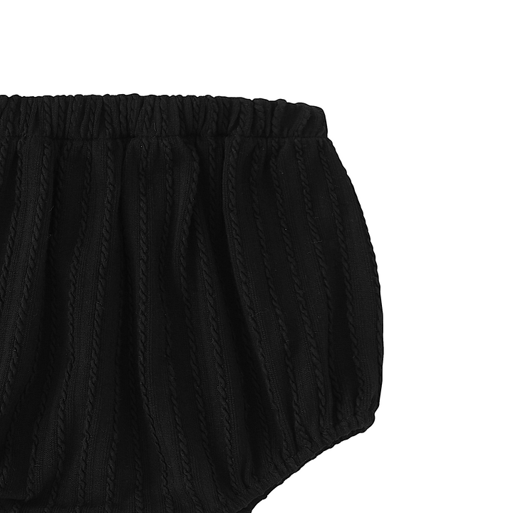 A refined and modern ensemble: the black top with a ruffled collar trimmed with lace pairs with matching bloomers for an elegant and timeless look. The delicate contrast between the white embroidery and the depth of the black creates a unique charm.