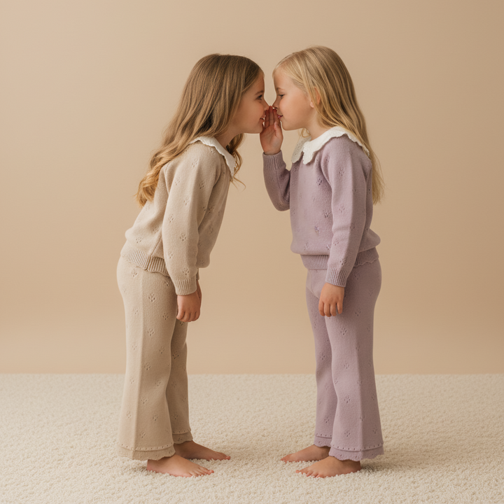 A sophisticated and comfortable ensemble for cool days. Featuring a soft knit sweater with an embroidered Peter Pan collar and matching pants, this set combines classic style with absolute comfort. A perfect outfit for any occasion, from everyday wear to more formal events.