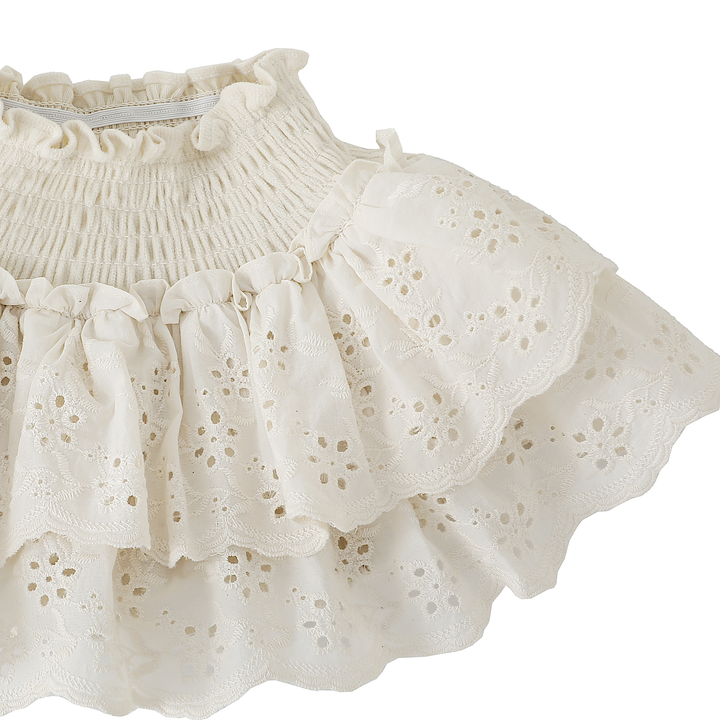 A poetic and refined English embroidery skirt that adds charm and lightness to baby's outfits. Its airy ruffles and delicate fabric make it a graceful piece.