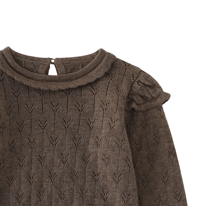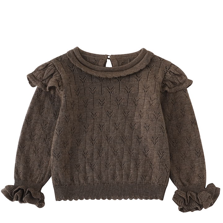 An elegant and refined sweater: its openwork knit and delicate ruffles make it a poetic and timeless piece. Comfortable and chic, it accompanies baby in style throughout the year.