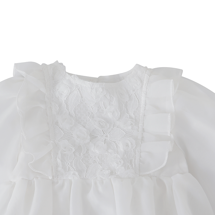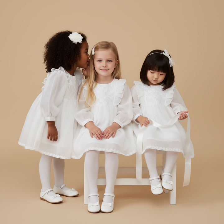 A pristine white dress, full of grace and poetry. With its puffed sleeves and refined lace, it transforms every moment into a precious memory.