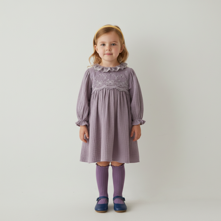 A delicate charm blows across this waffle cotton gauze dress, enhanced by an embroidered bib and a scalloped tulle collar. Its soft and enveloping grayish lavender hue makes it an ideal piece for precious moments.